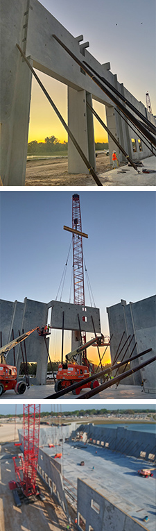 Building 100 spanned 116,275 square feet and used 105 panels, while Building 200 measured 146,740 square feet and included 122 panels. Beyond panel erection, the scope of work covered paving, sidewalks, dolly pads, stairs, and ADA-compliant ramps. What set this project apart were the challenging spandrel panels and 8-foot return leg panels, which required exacting placement, consistent surface quality, and close coordination between construction crews and materials suppliers.