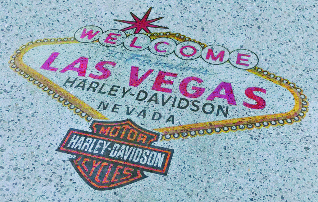 Outside the Las Vegas Convention Center – in addition to seeing our ads on the benches – tradeshow attendees could see our products in action at Concrete Decor Live! Nox-Crete colors and textures from the Duro-Color Floor System were used to create a Las Vegas / Harley-Davidson logo in the orange building’s “biker bar”.